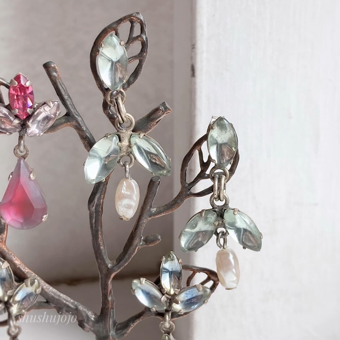 マーキスカットのヴィンテージガラスを用いた、揺れるデザインのピアスです。