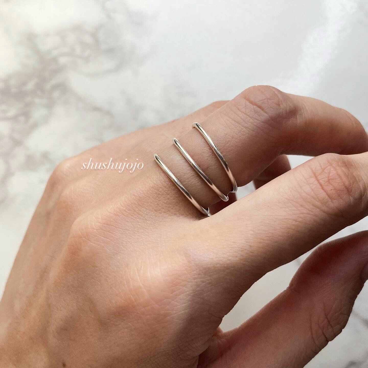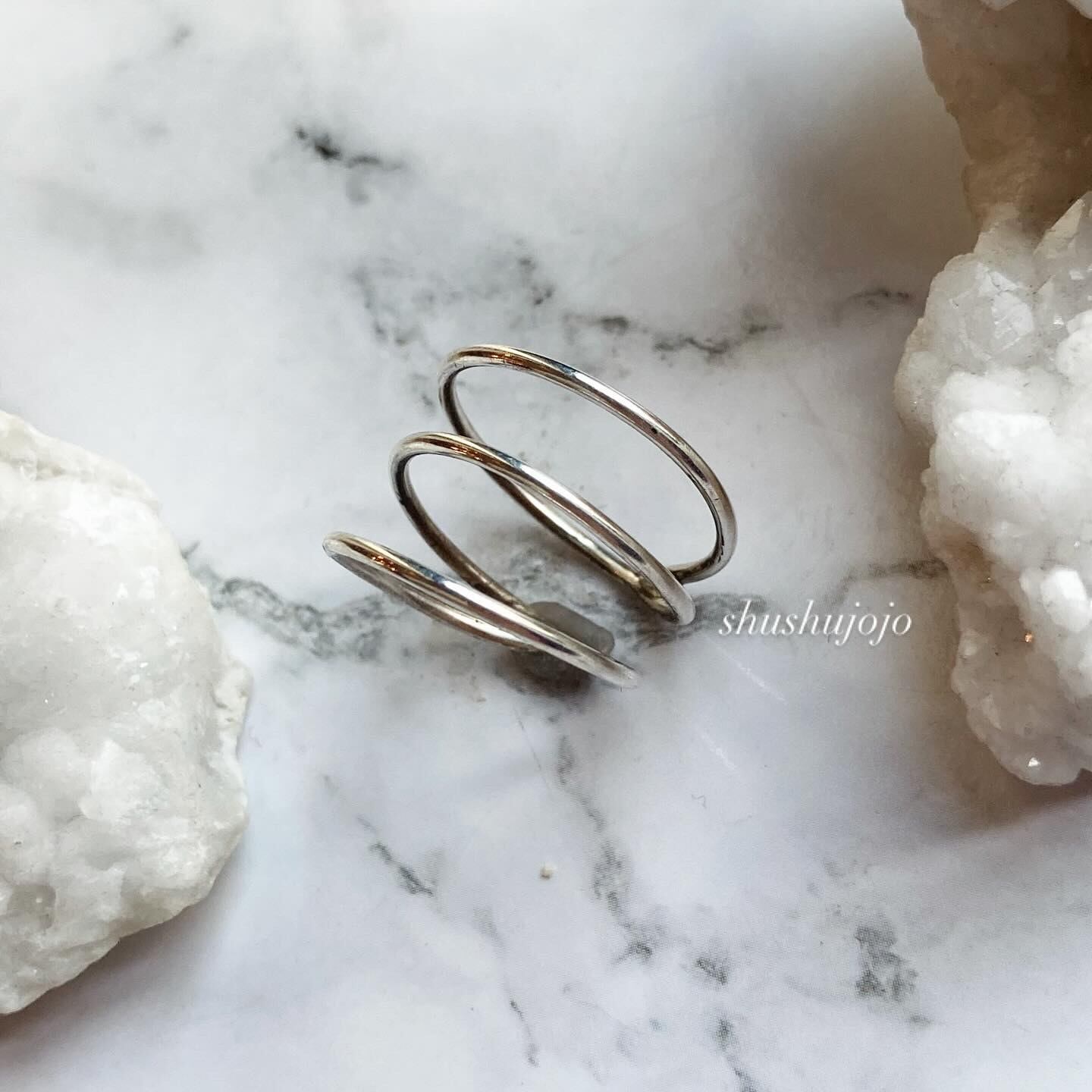 指に巻き付く、螺旋のようなデザインになっていて、正面から見ると3連に見えるユニークなリングです。