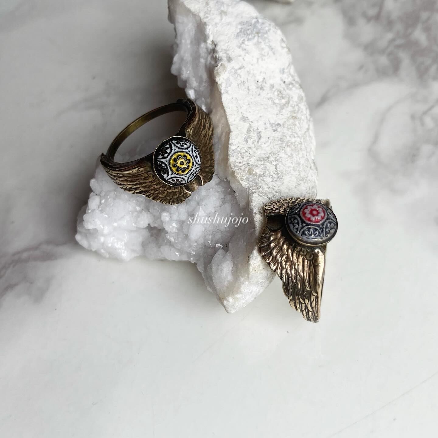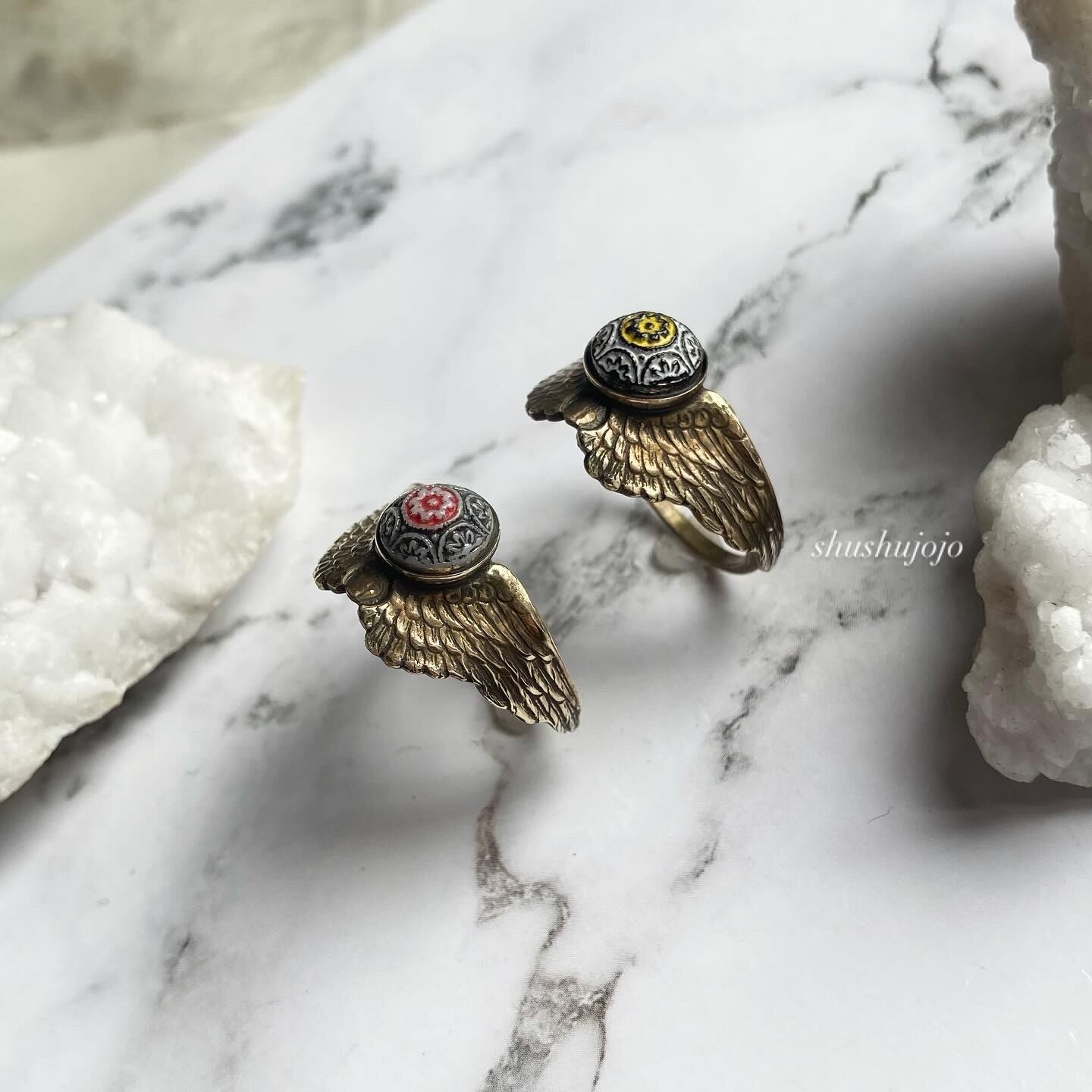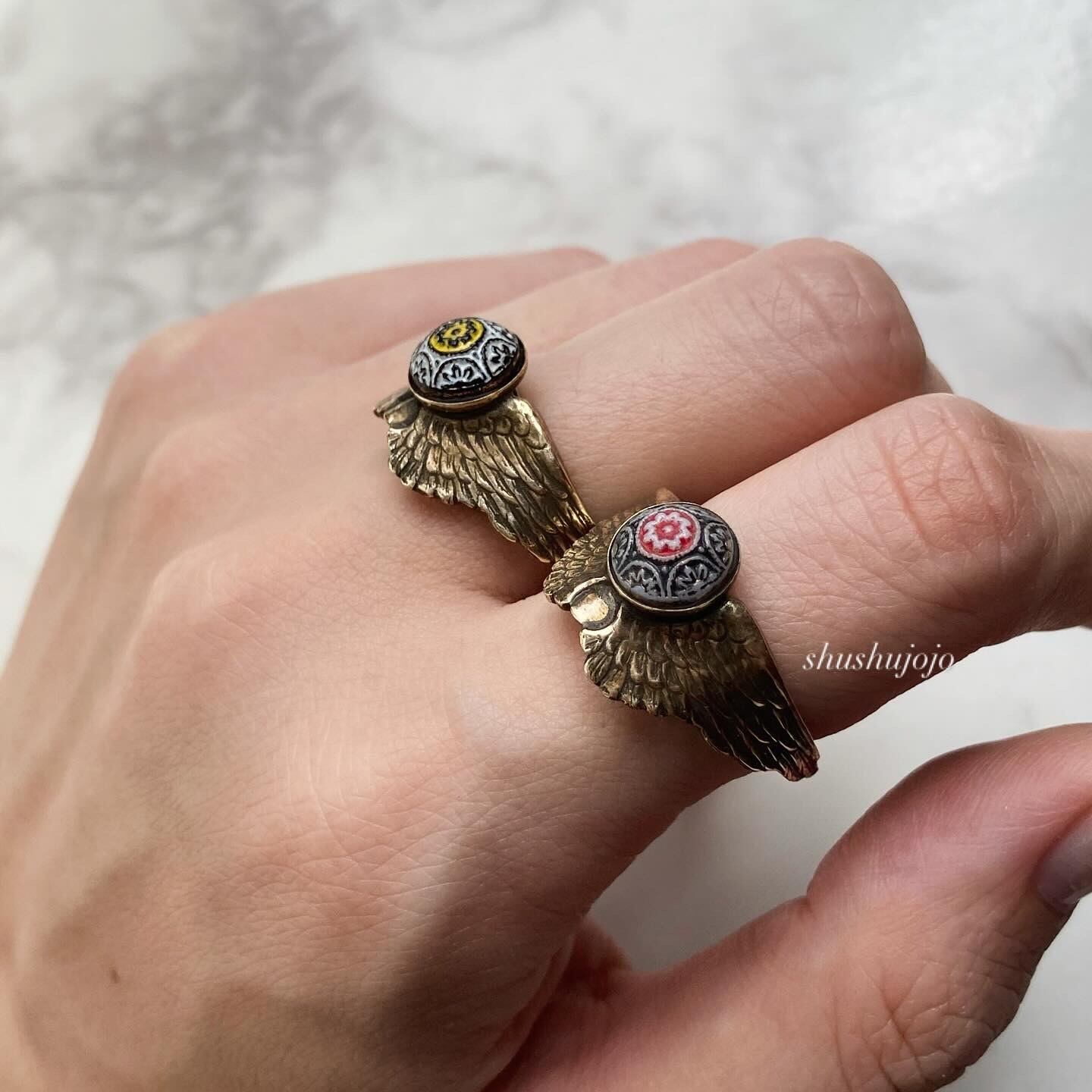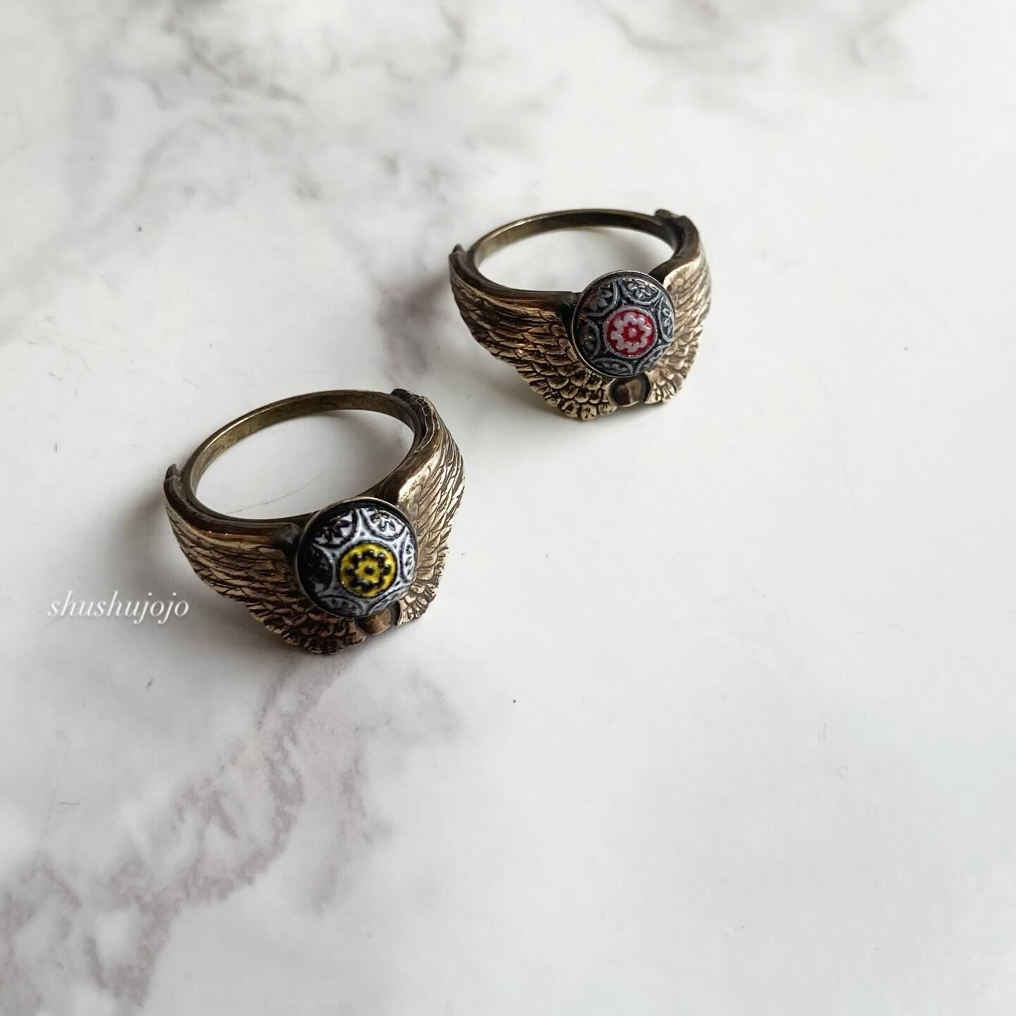 翼のデザインに半立体の球体モチーフがついたヴィンテージリングです。