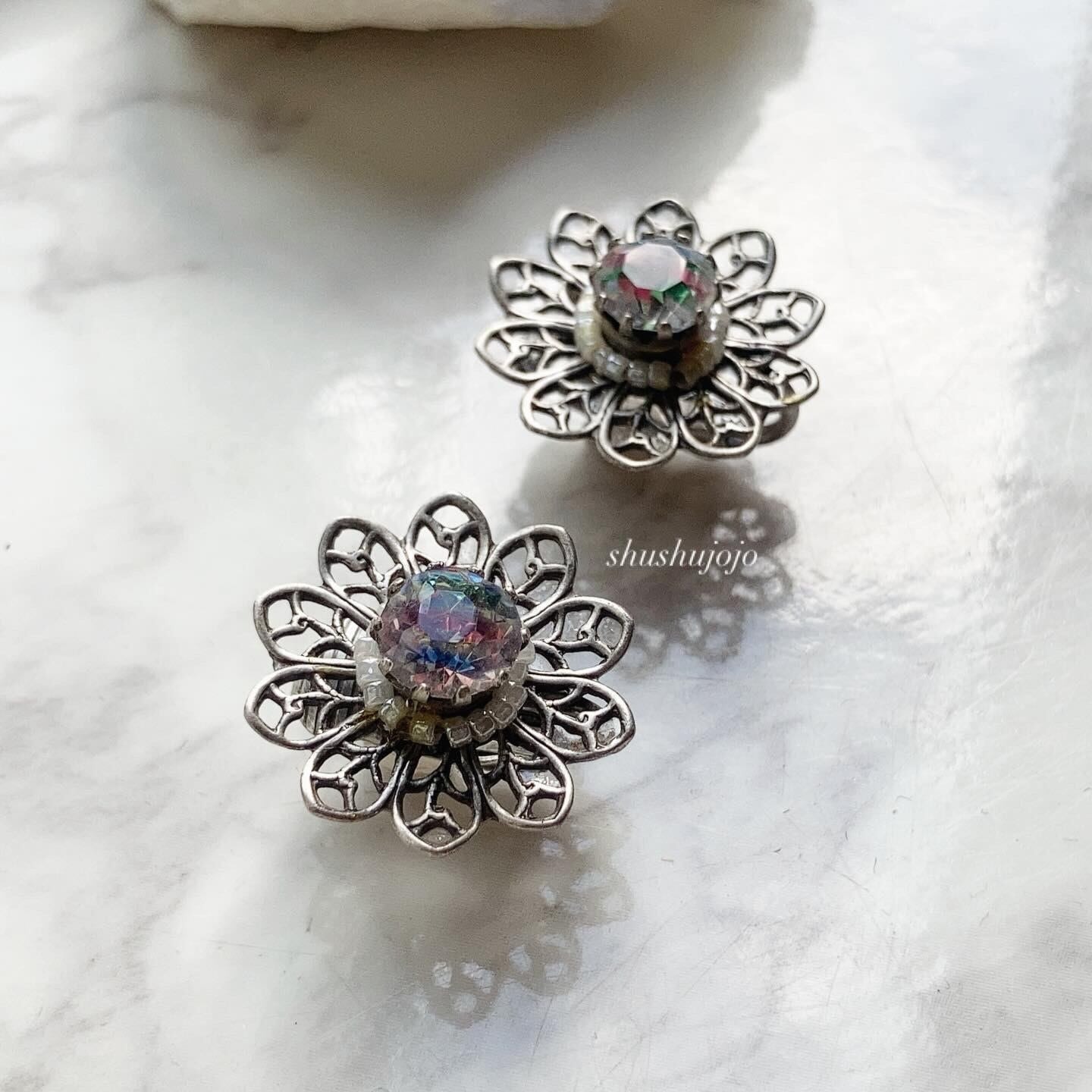 花芯部分にアイリスガラスがあしらわれたピアスです。