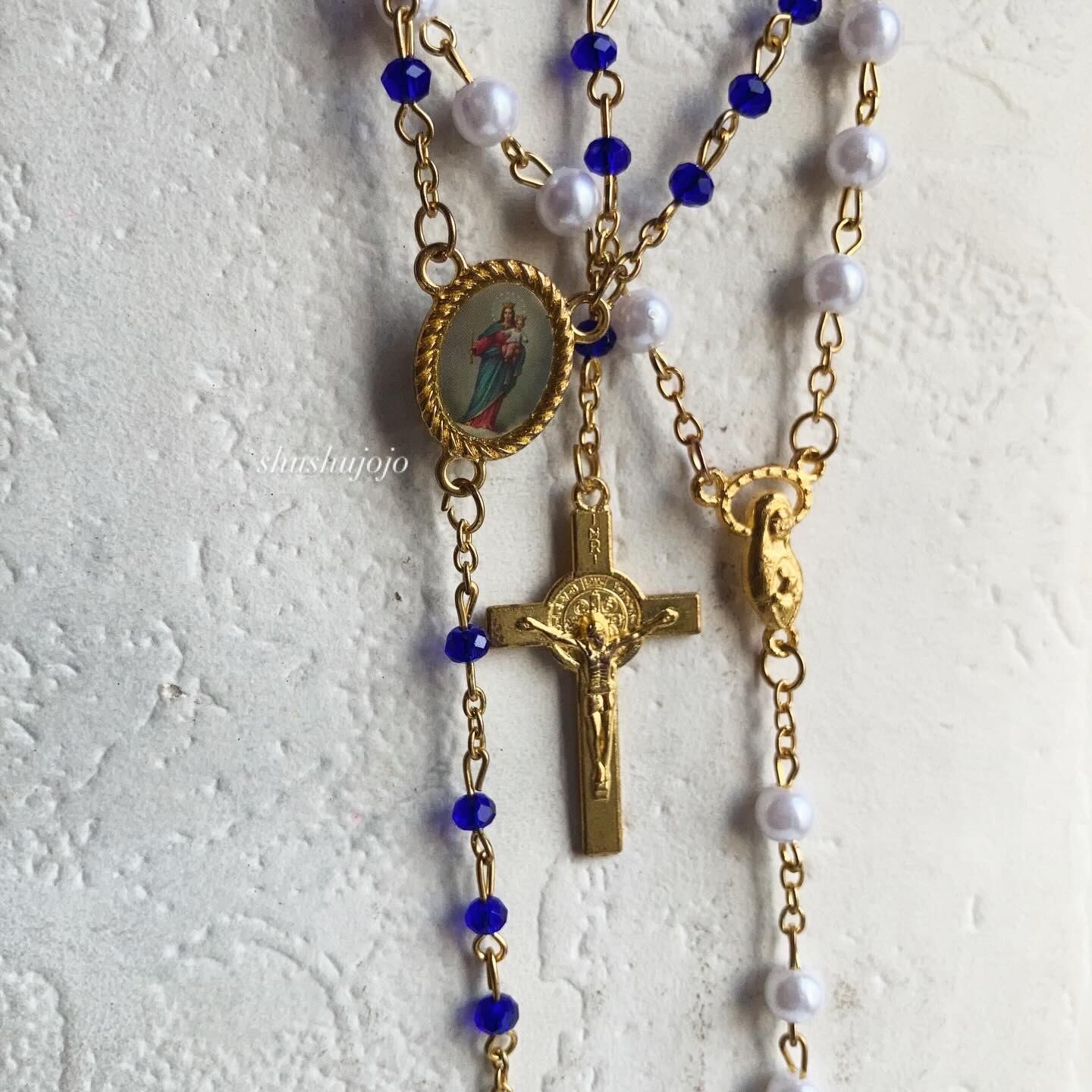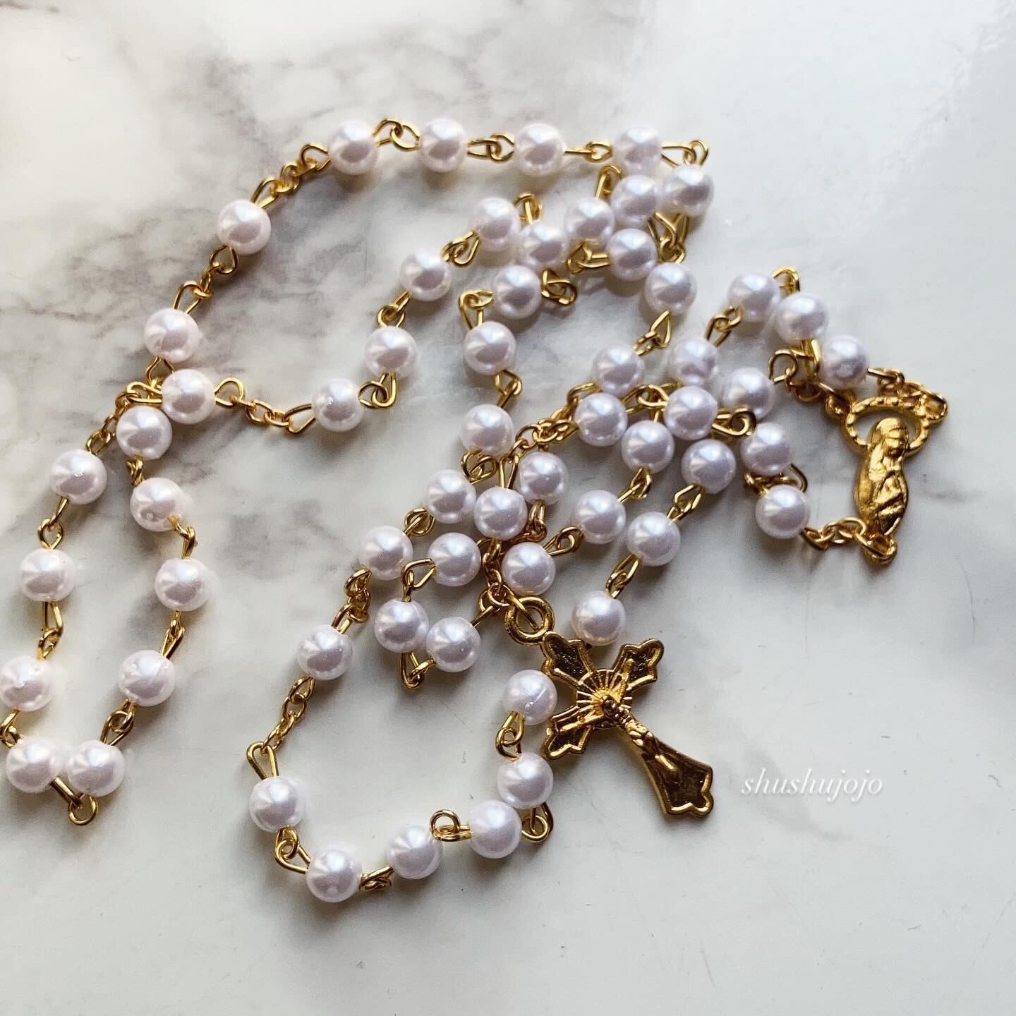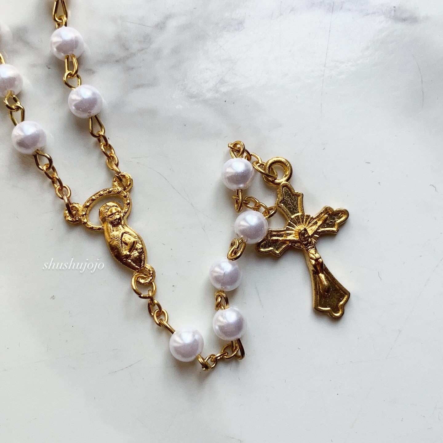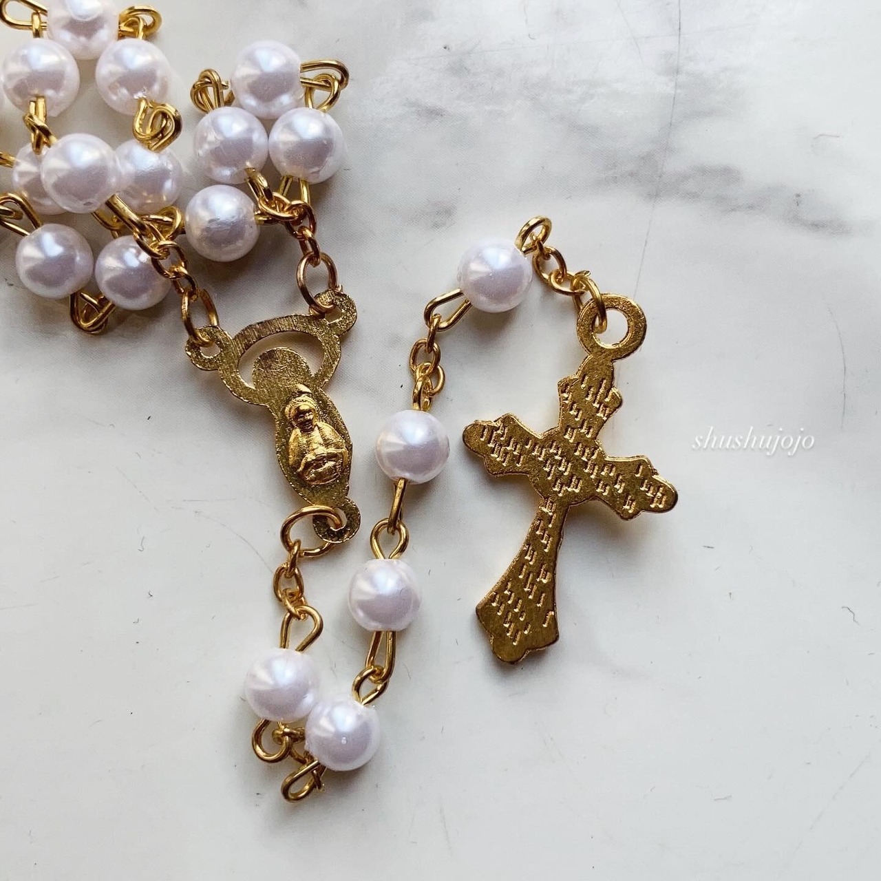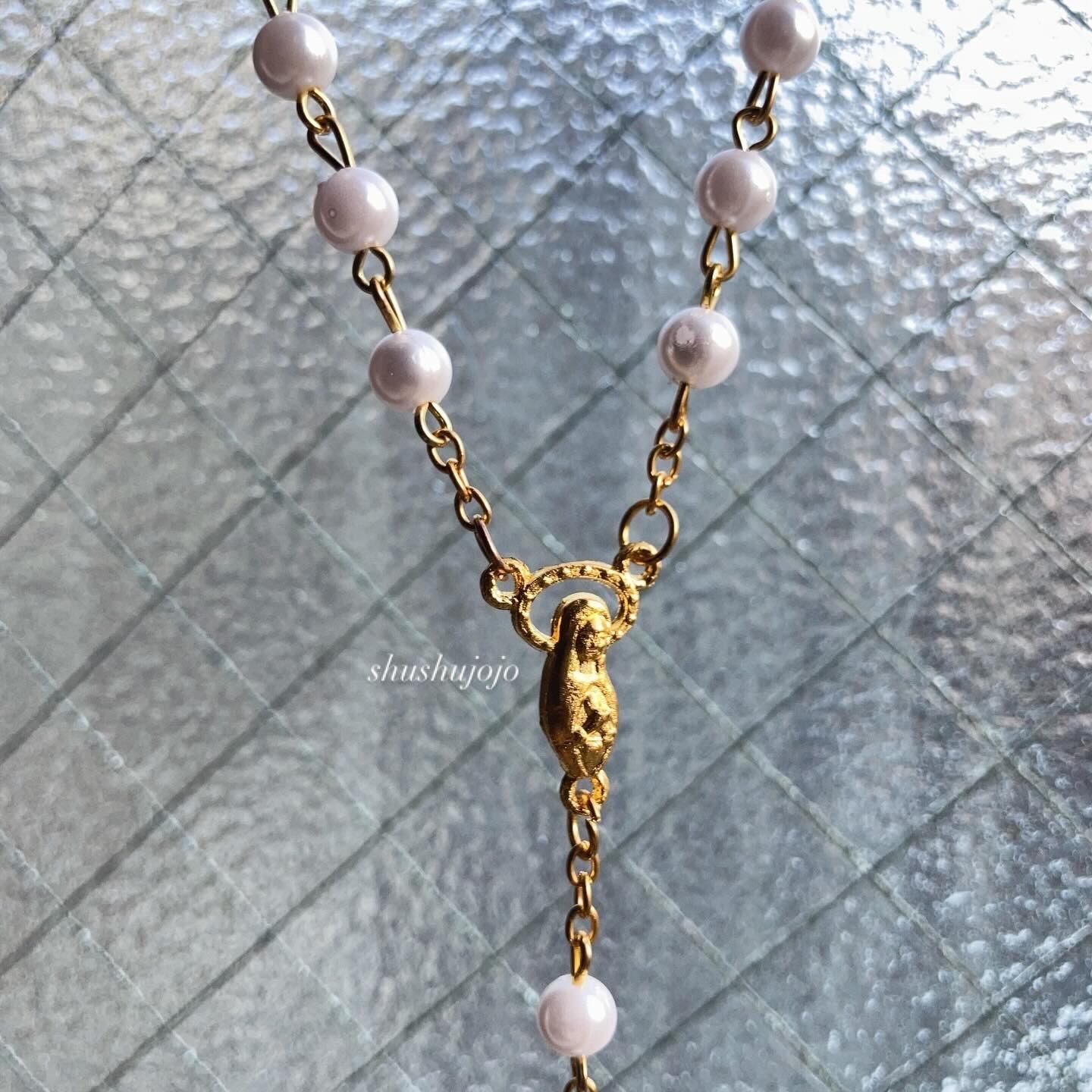 ゴールドカラーのメダイの組み合わせが華やかなロザリオです。