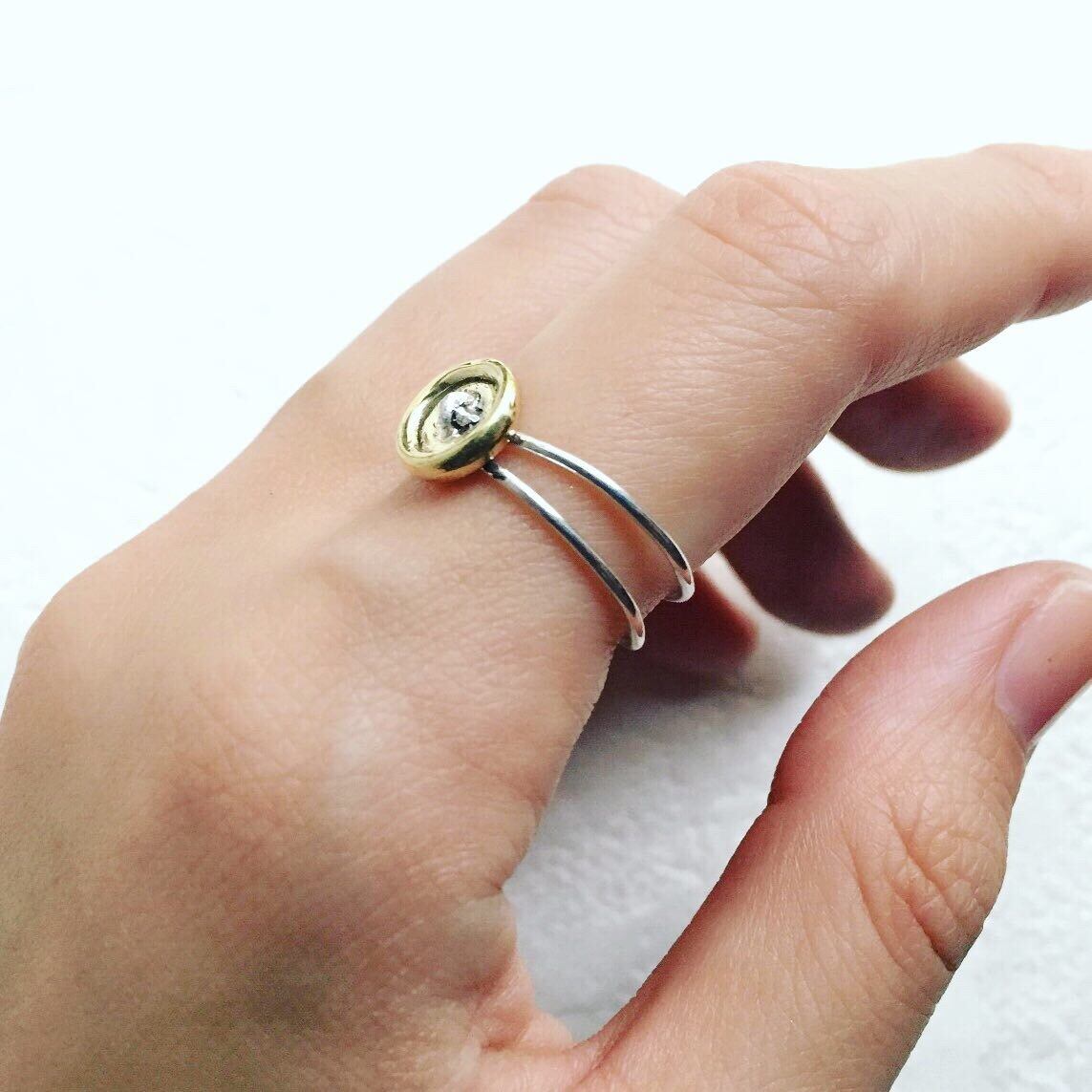ボタンの穴に糸を通すように、細いシルバーを通して作られた、細工の細かなリングです。