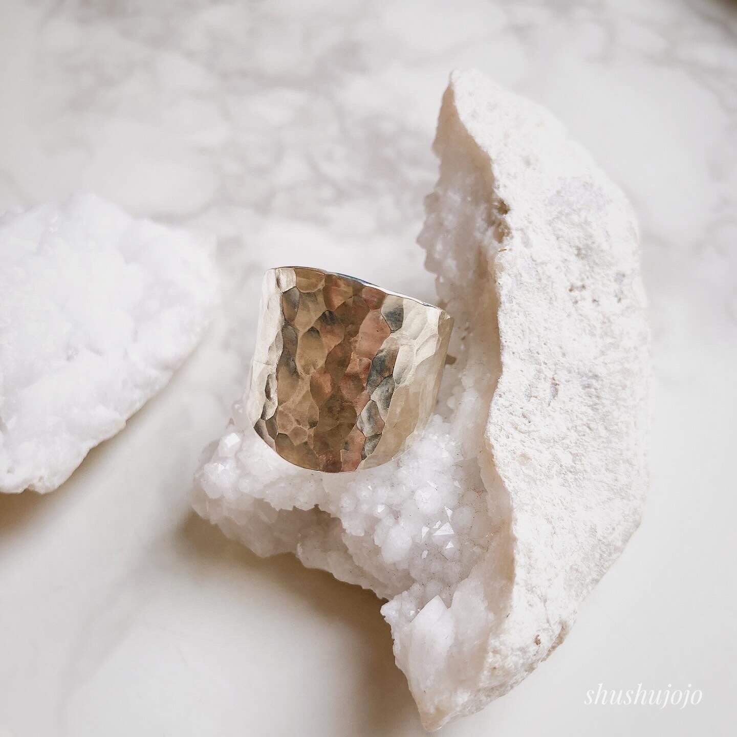 幅のあるリングですが(手の甲側 約2センチ)、リング内側は約5ミリ幅になっているので、あまり圧迫感もなく着けられます。