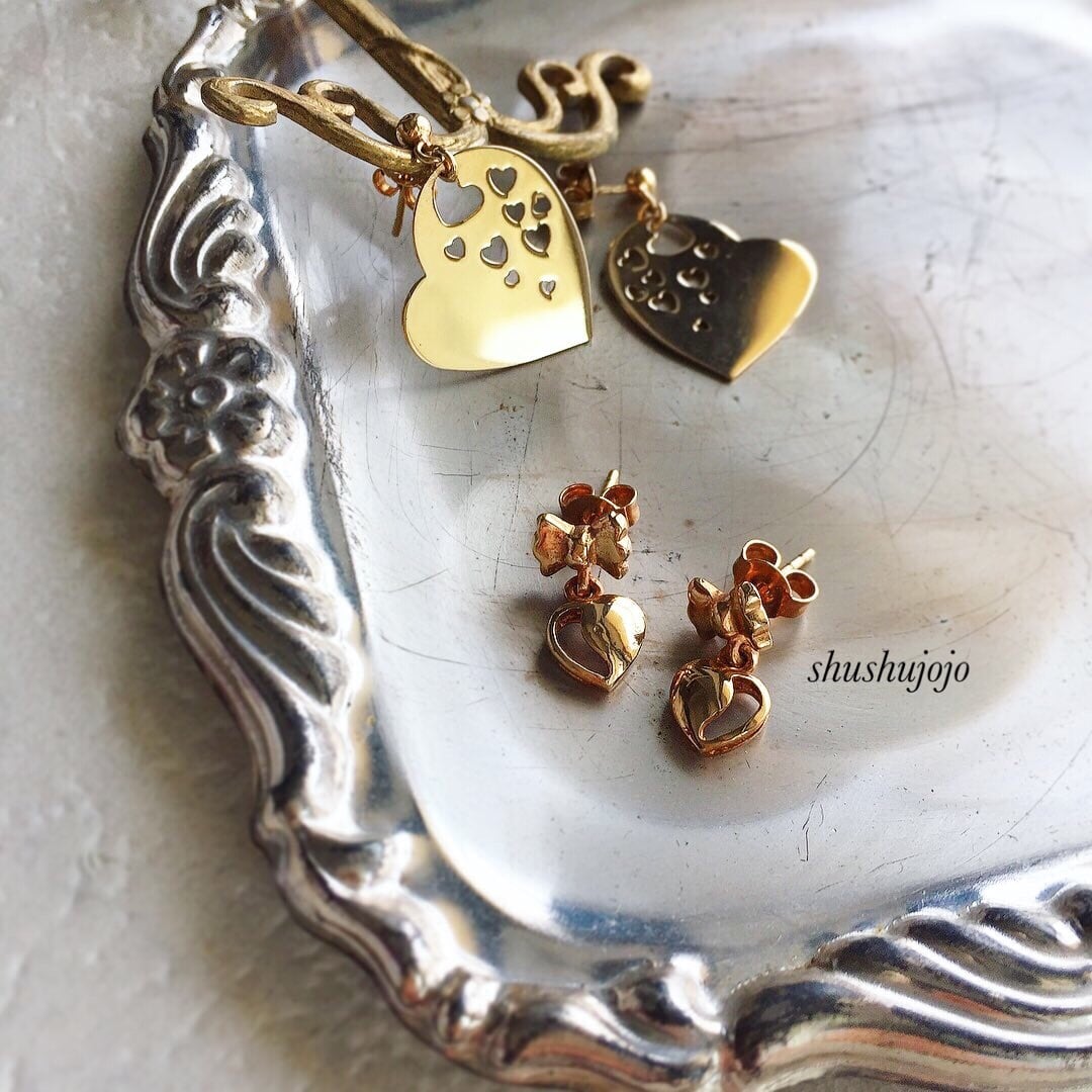 小さなリボンモチーフに、揺れるハートの組み合わせがガーリーなピアスです。