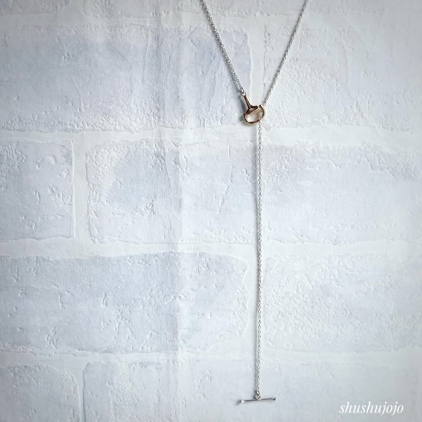 馬具のビットの形をした金具に、Tバーを通して着用するラリエットネックレスです。