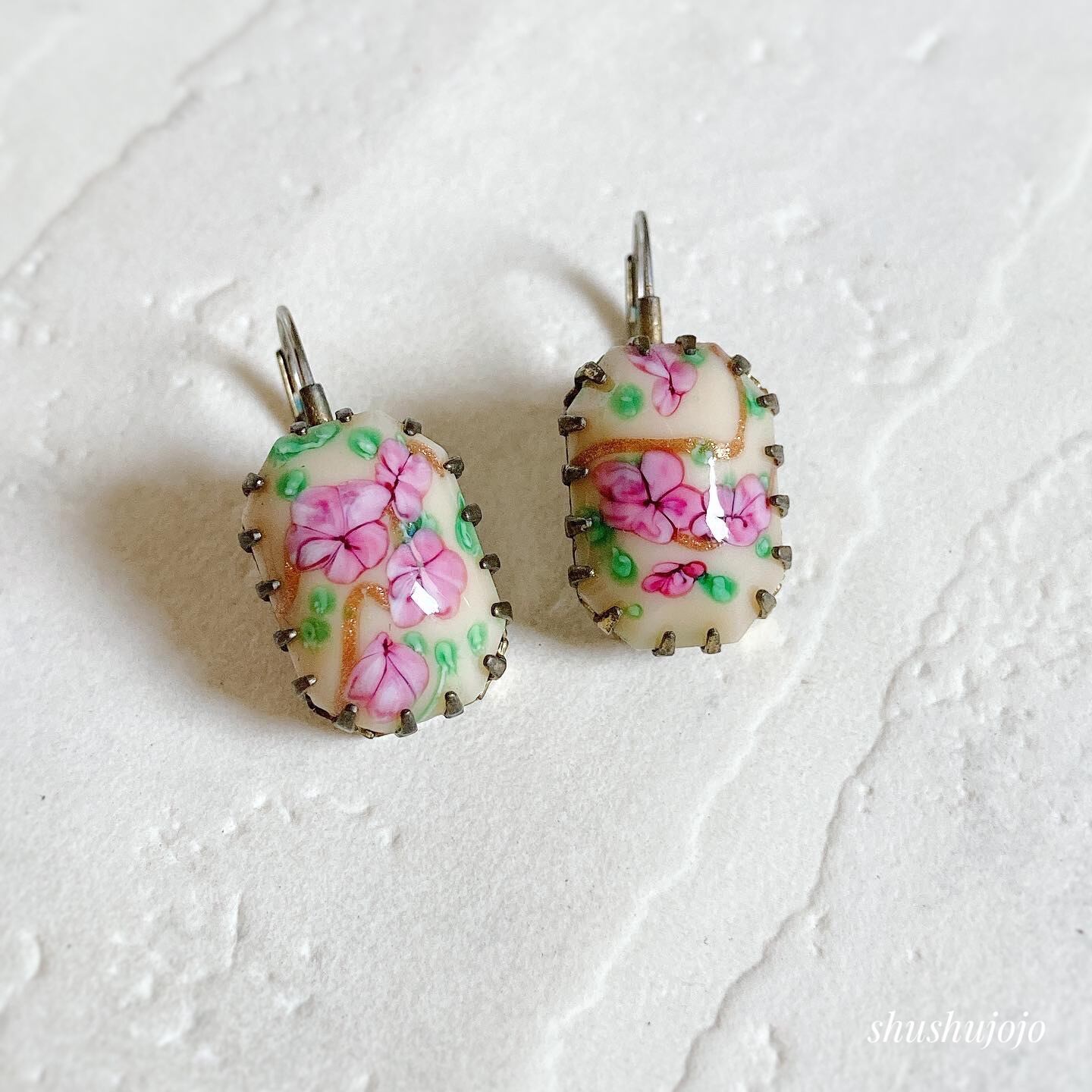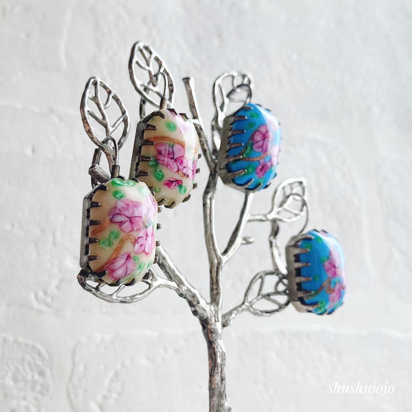 まるで桜の様な、枝先から咲くピンク色の花が描かれた、珍しいガラス。