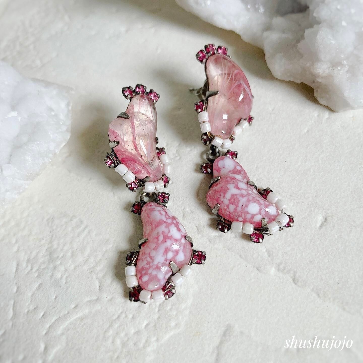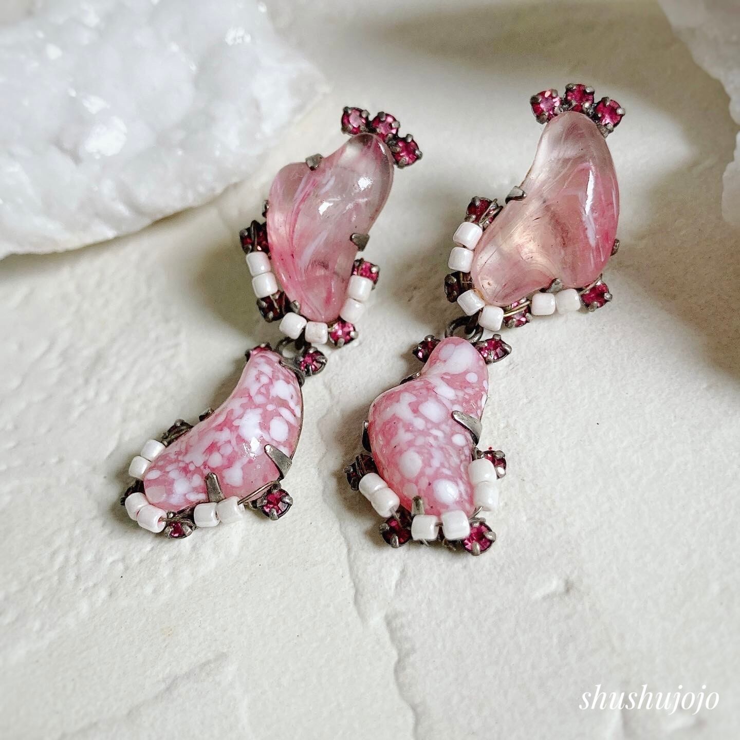 ガラスの縁にはビーズやラインストーンの装飾が所々施されています。アシンメトリーなデザインが他にはないアクセサリーです。