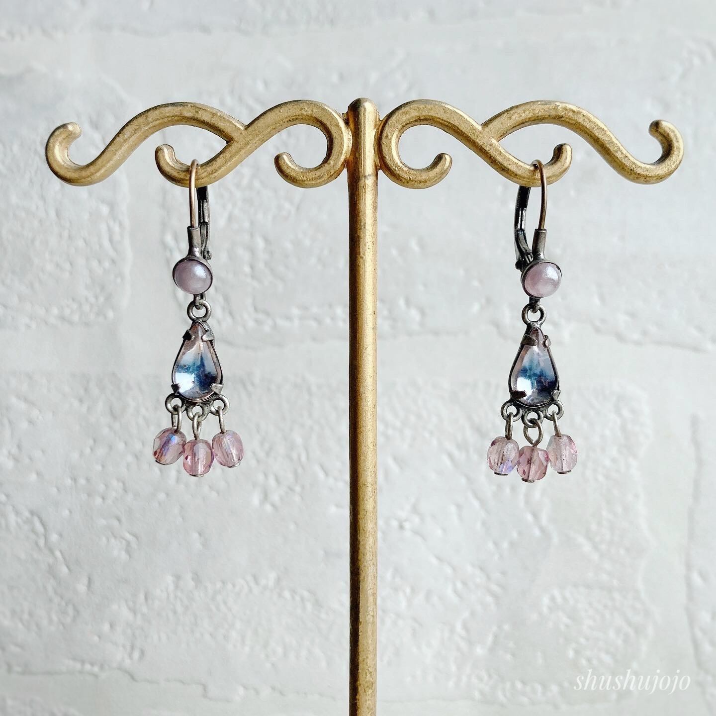 しずく型の小ぶりなヴィンテージガラスが揺れるピアスです。