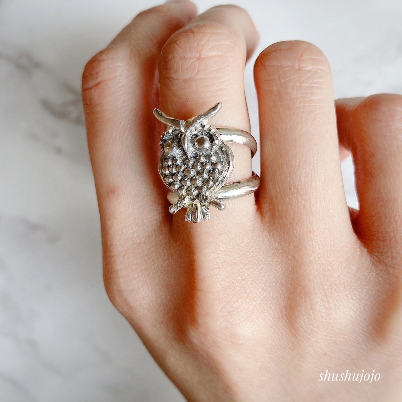 silver owl motif ring