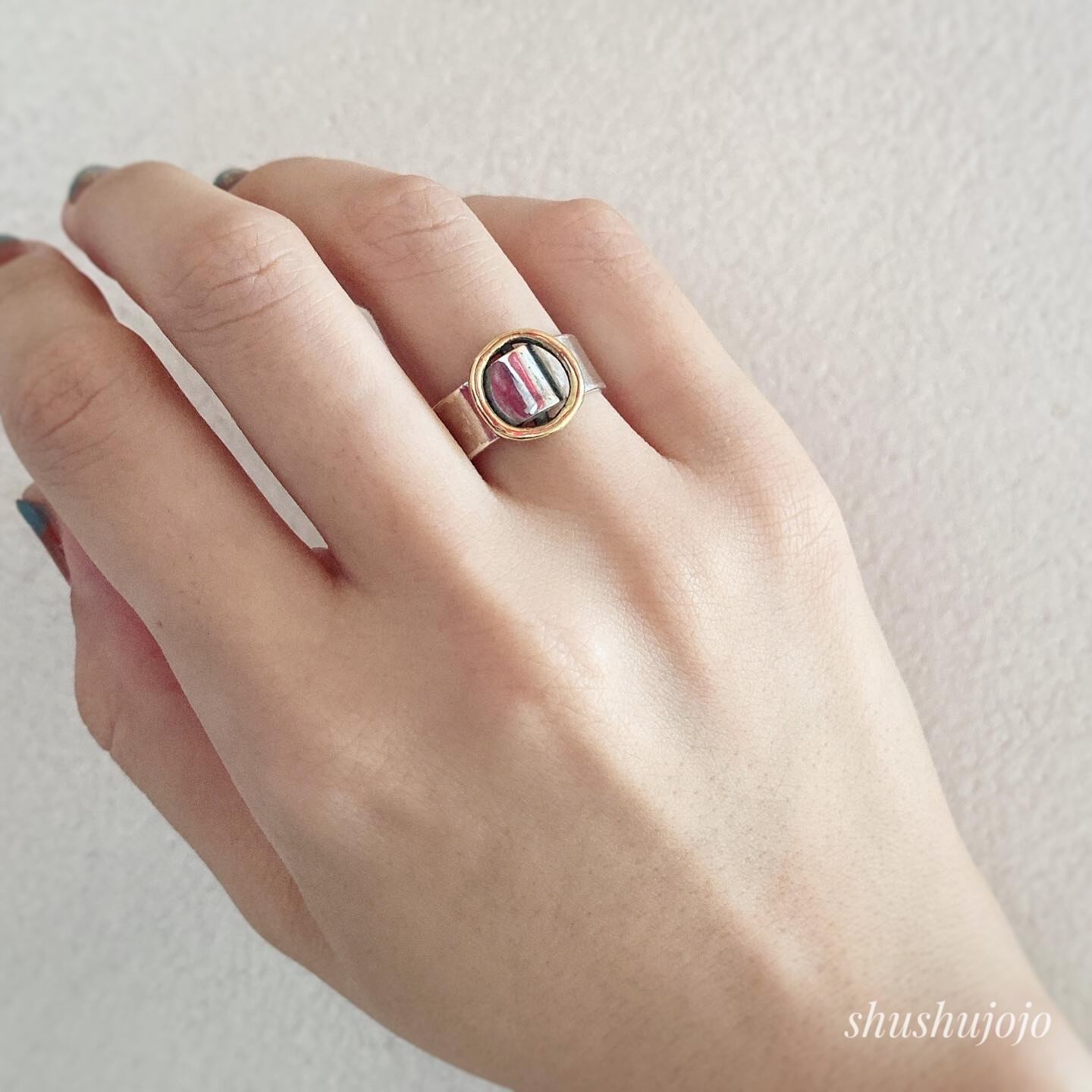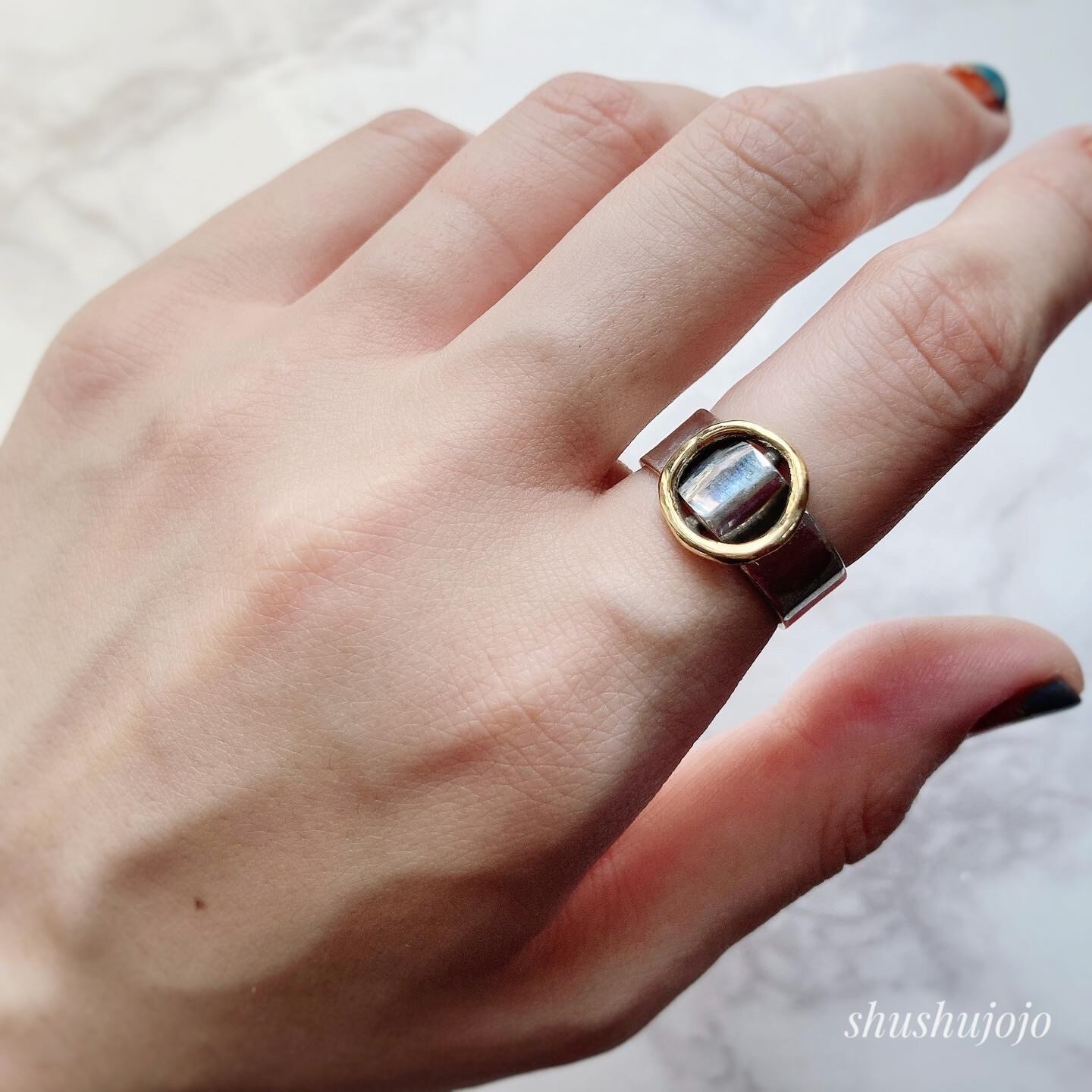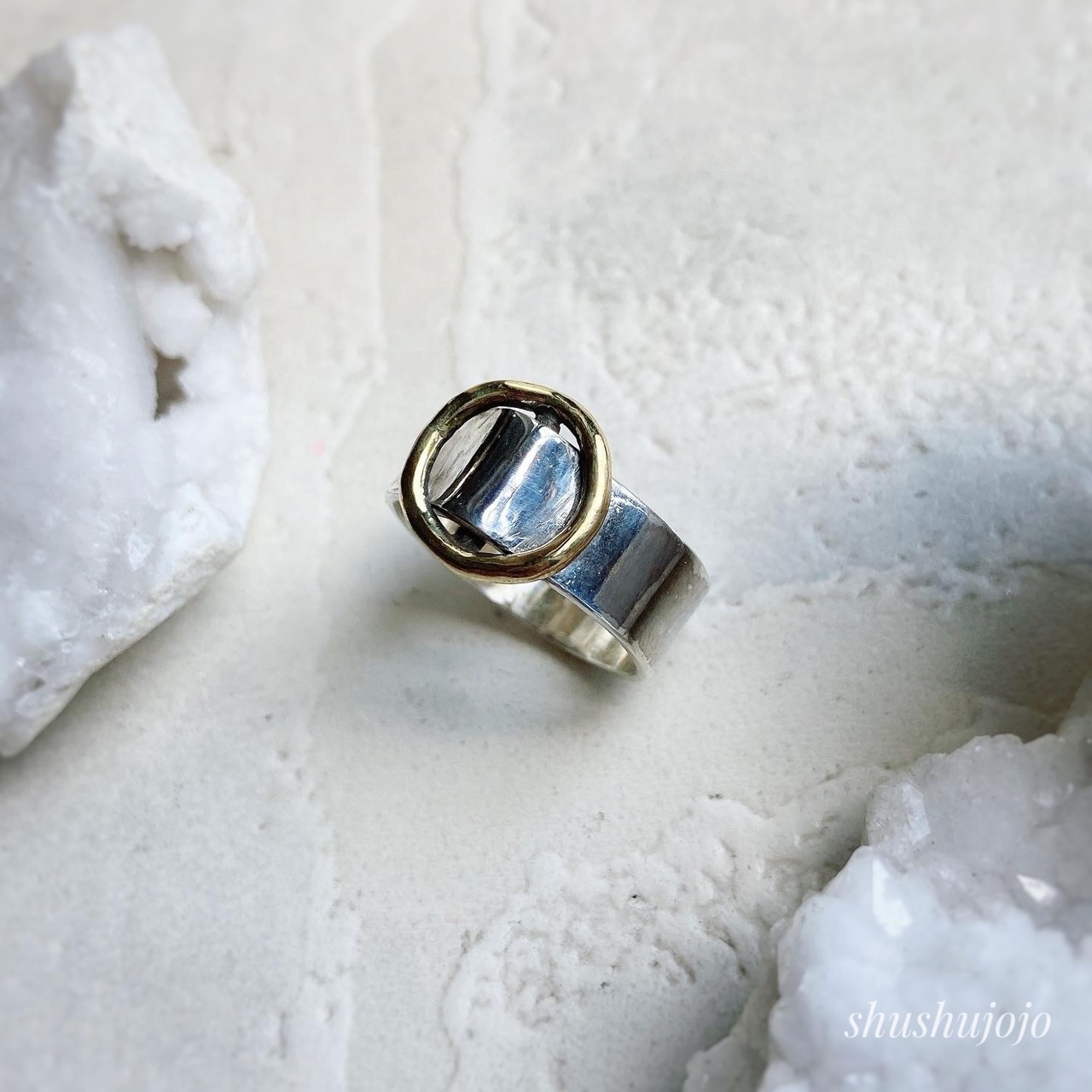 幅のあるシルバーに、ゴールドカラーのバックルモチーフを組み合わせたベルトデザインのリング。