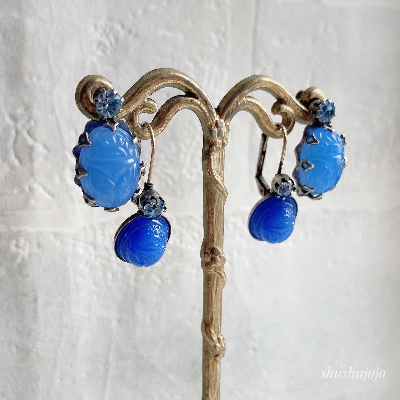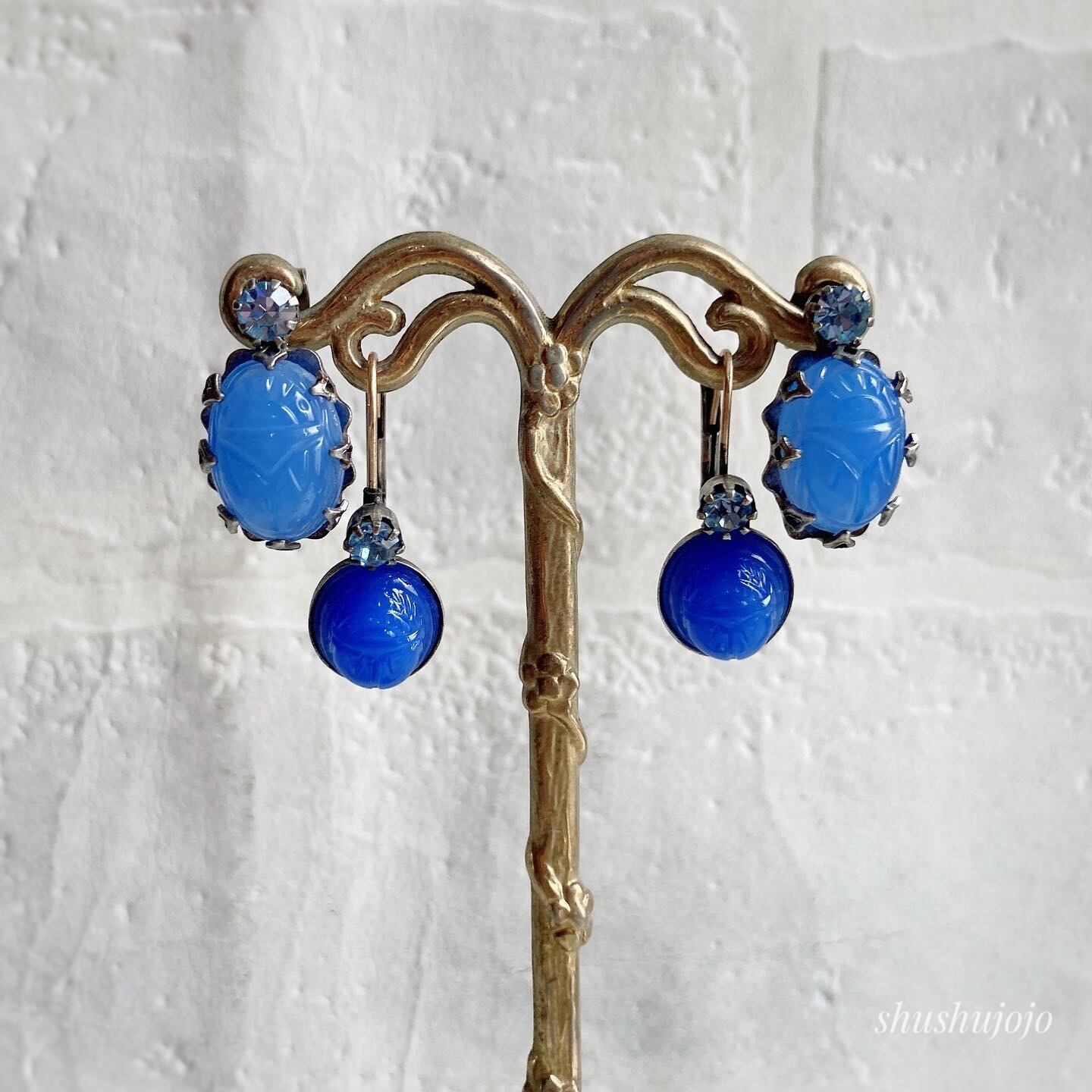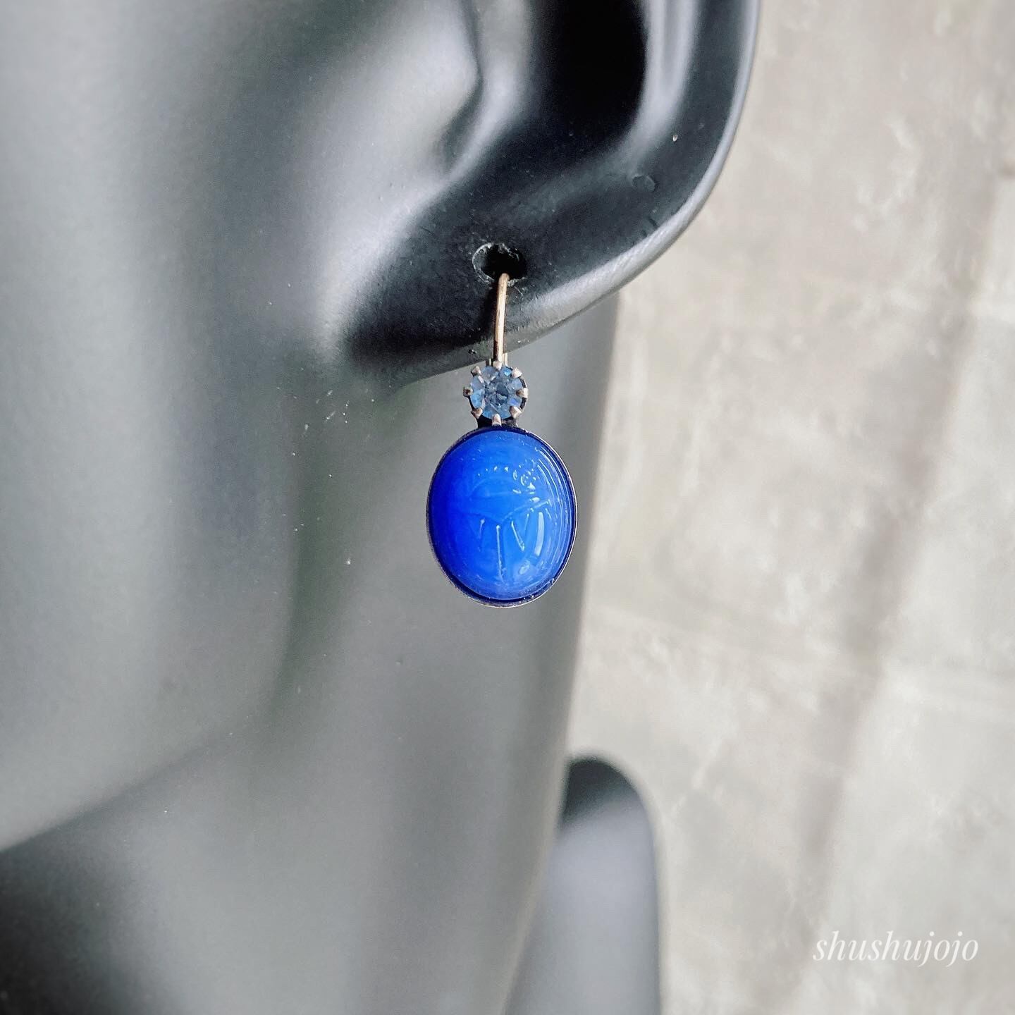 ラッキーモチーフ、スカラベ の彫られたヴィンテージガラスのピアスです。