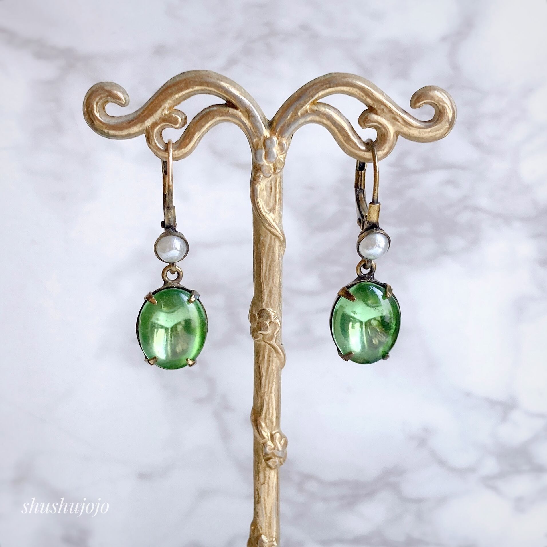 ぷっくりとした、オーバル型のカボションガラスが揺れるピアス。