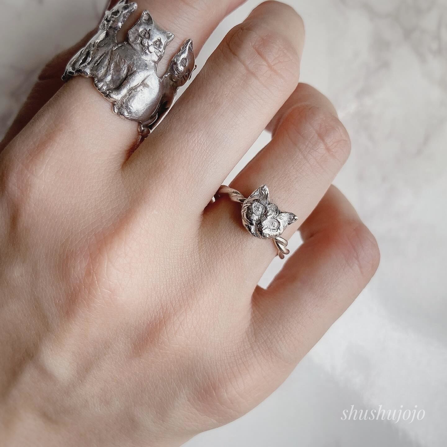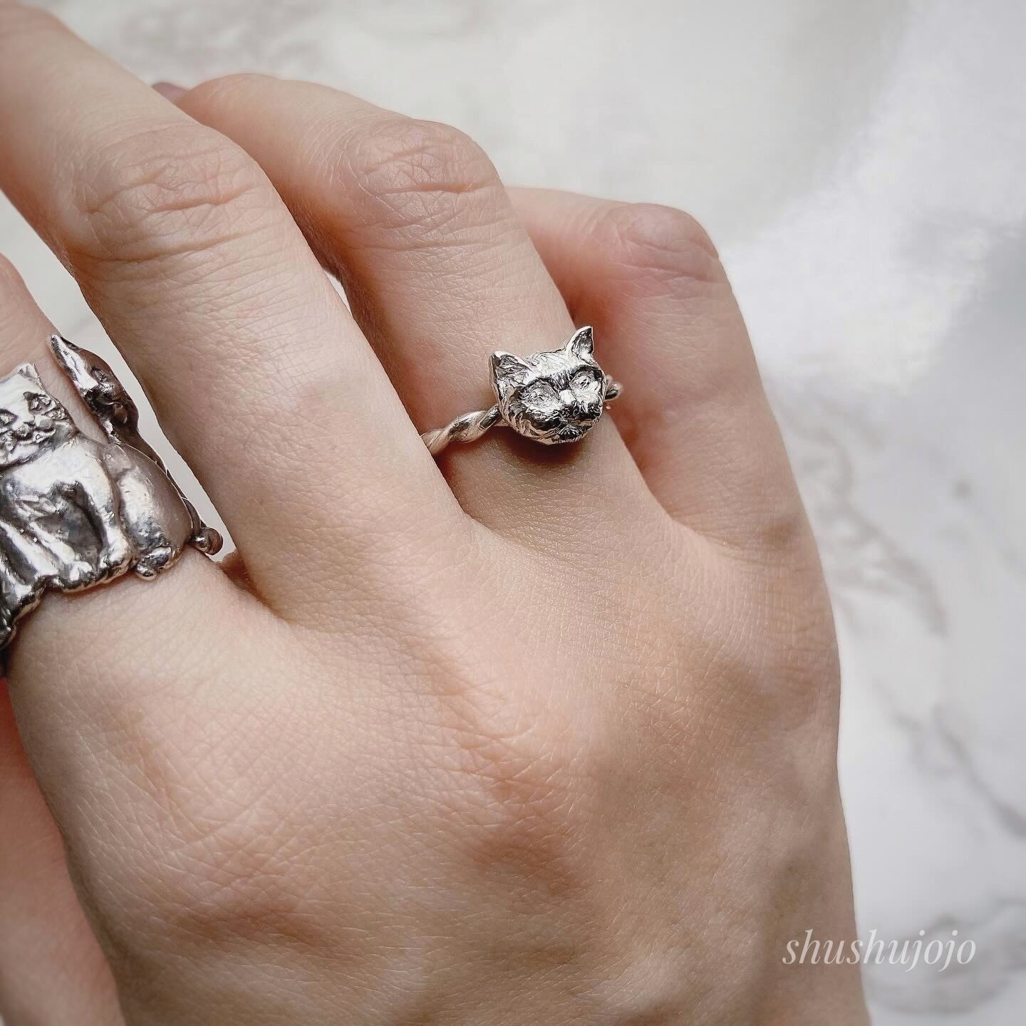 silver cat motif ring
